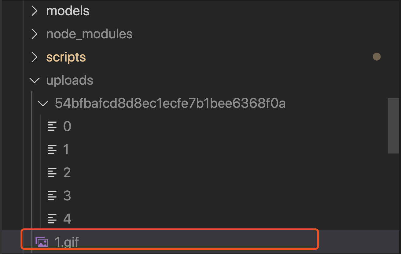 后台接收到上传请求后,首先查看名称为文件 MD5 的文件夹是否存在,不存在则创建文件夹,然后通过 fs-extra 的 rename 方法,将切片从临时路径移动切片文件夹中,结果如下: