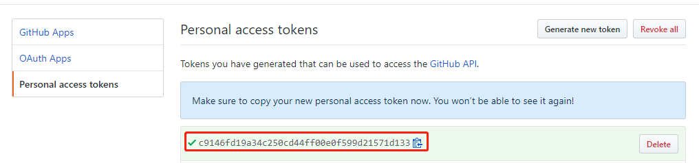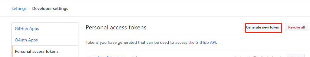 在Settings页面点击进入 Developer settings (开发者设置)再点击进入Personal access tokens (个人授权令牌)页面生成一个令牌 点击 Generate new token