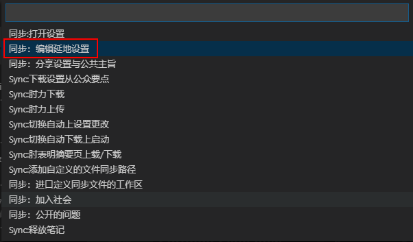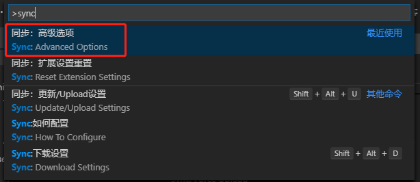 回到VSCode编辑器中 使用快捷键Ctrl+P 输入命令 >sync 点击 同步:高级选项