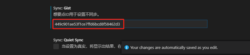 PS:这里可以思考一下,为什么第一次设置Settings Sync需要创建Token 这里就不需要设置Token了,其实你可以这么理解 Gist ID 它用来标记你的仓库号码 你可能有多个仓库 你的仓库大门用的都是刷脸验证(令牌Token验证),也就是说。Token你只需要创建一个对应Gist的Token即可(多个也可以) 它们都可以打开你的Token,因为在第之前我设置好了token,所以这里我只需要设置好Settings Sync 相应的仓库号码。就可以完成同步了。