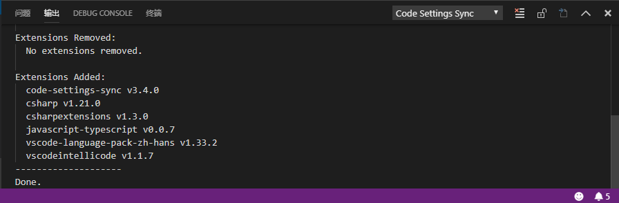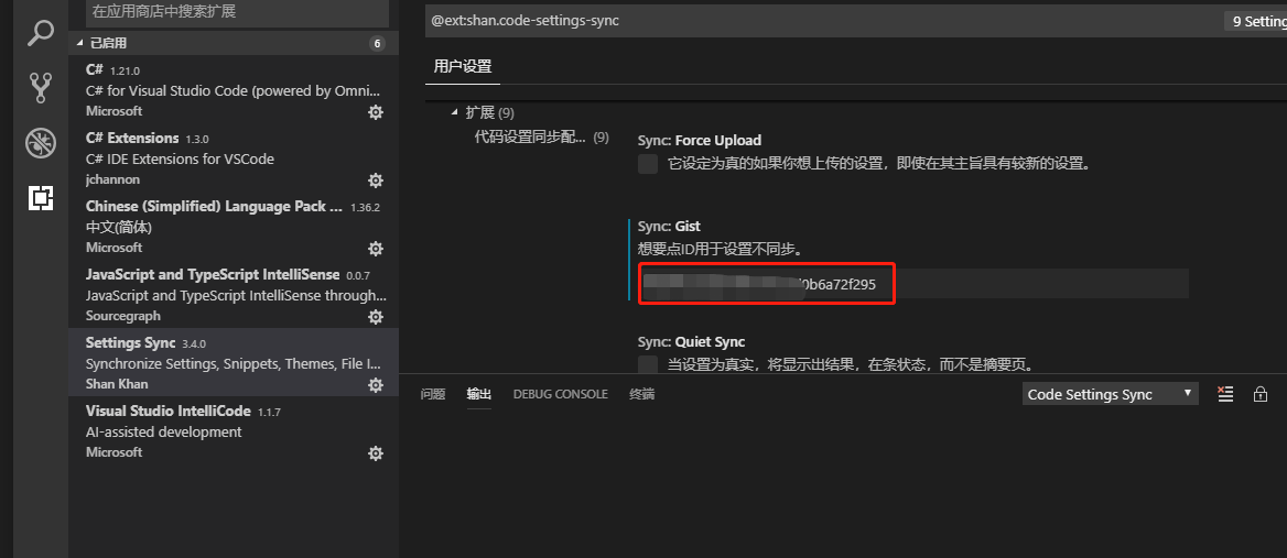 Settings Sync扩展 会在输出区域提示 这里提示没有扩展别移除(因为第一次同步) 然后6个扩展被同步。