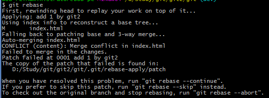 (2)若本地对文件修改,没有add,rebase时,会提示“Cannot rebase: You have unstaged changes.Please commit or stash them.”,add后没有commit,会提示“Cannot rebase: Your index contains uncommitted changes.Please commit or stash them.”。commit后,如果没有修改同一文件,rebase不会冲突。
