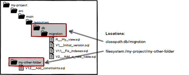 Migrations是指Flyway在更新数据库时是使用的版本脚本,比如:一个基于Sql的Migration命名为V1__init_tables.sql,内容即是创建所有表的sql语句,另外,Flyway也支持基于Java的Migration。Flyway加载Migrations的默认Locations为classpath:db/migration,也可以指定filesystem:/project/folder,其加载是在Runtime自动递归地执行的。