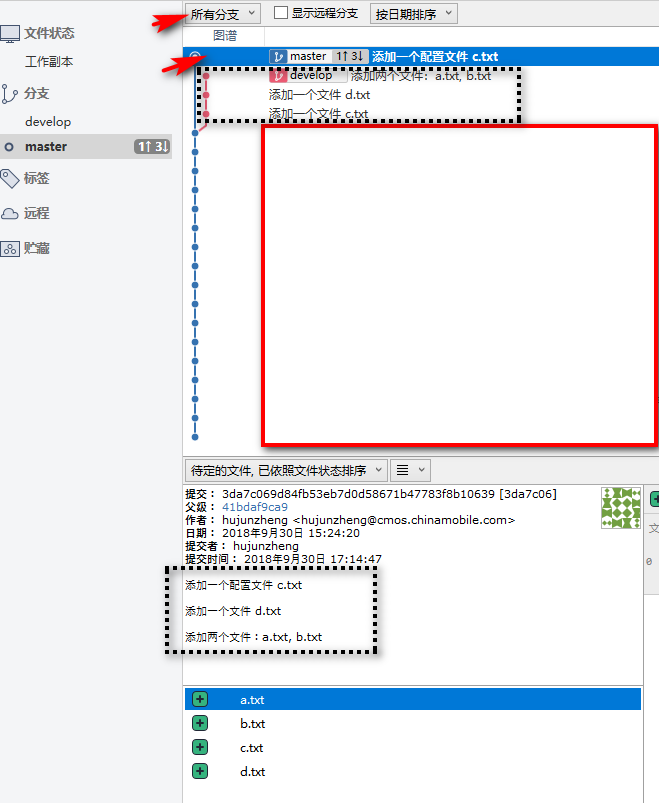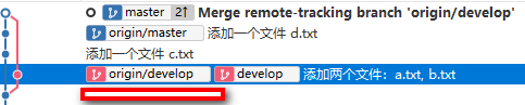 看一下rebase的结果,就像是develop先把自己的提交保存起来,然后将master中的提交合并过来,最后在加上自身分支的提交,这样就不存在分支的合并效果了。