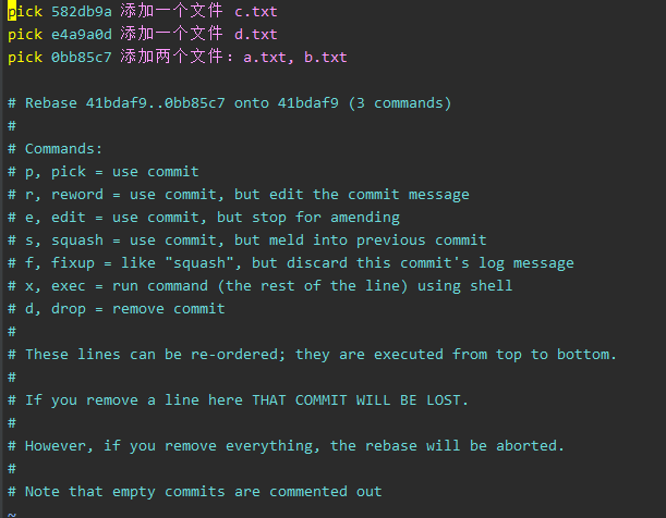 上面未被注释的部分列出的是我们本次rebase操作包含的所有提交,下面注释部分是git为我们提供的命令说明。每一个commit id 前面的pick表示指令类型,git 为我们提供了以下几个命令: