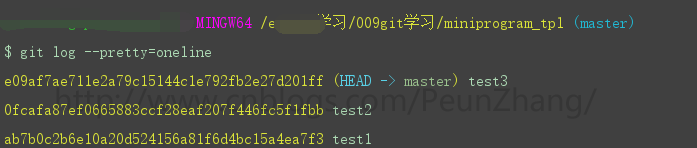 输入git log,我们可以看到最近的3次提交,最近一次提交是test3,最早的一次是test1,其中一大串黄色的字母是commit id(版本号)