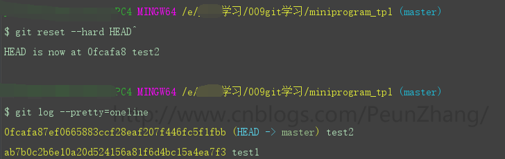 现在,我们要把当前版本test3上一个版本test2,就可以使用git reset命令:git reset --hard HEAD^,再查看日志,发现已经剩下2个commit版本了
