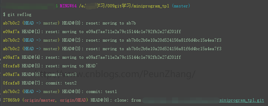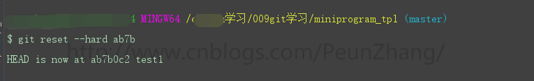 版本号可以不用写全,输入前4位或更多也是可以,Git会自动去找,不能只写前一两位,因为Git可能会找到多个版本号。比如,看完test3版本的代码后,现在想回退到最初test1版本,我们找到那个test1的commit id是ab7b0c2b6e10a20d524156a81f6d4bc15a4ea7f3,然后输入下面指令就回来了