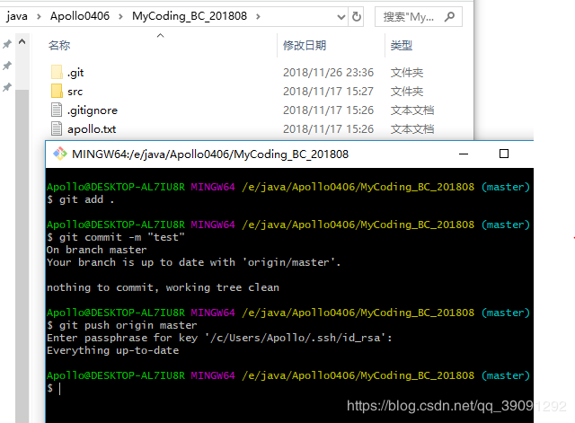 例如Coding1_BC_201808是我们需要提交的文件。我们直接将这个文件拖到指定仓库的指定路径下,然后退出到MyCoding_BC_201808这个仓库的目录下,进行push操作(由于示例的文件夹已push过了,所以commit的结果是working tree clean):