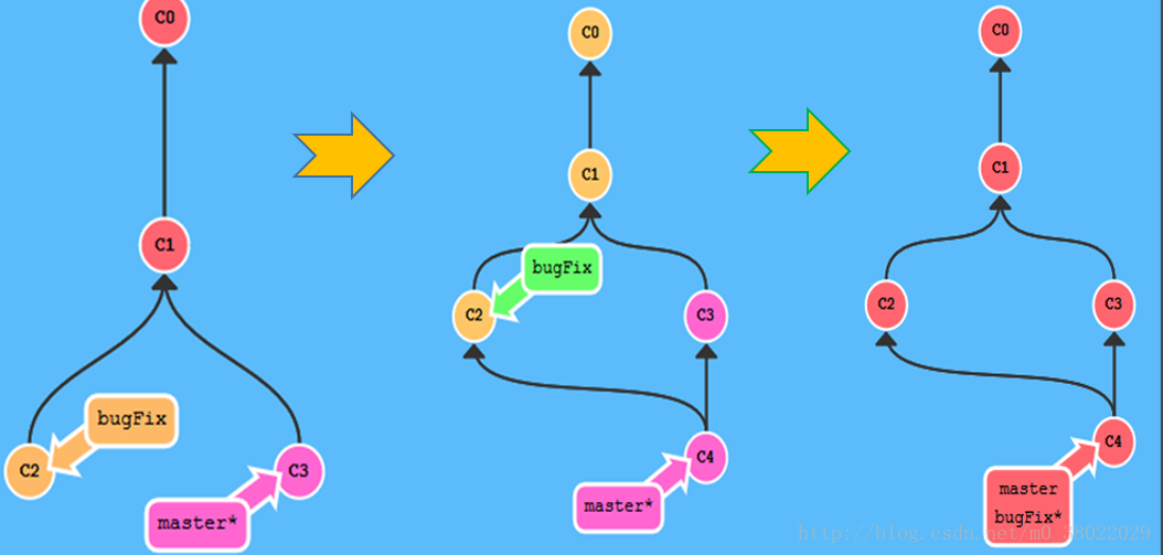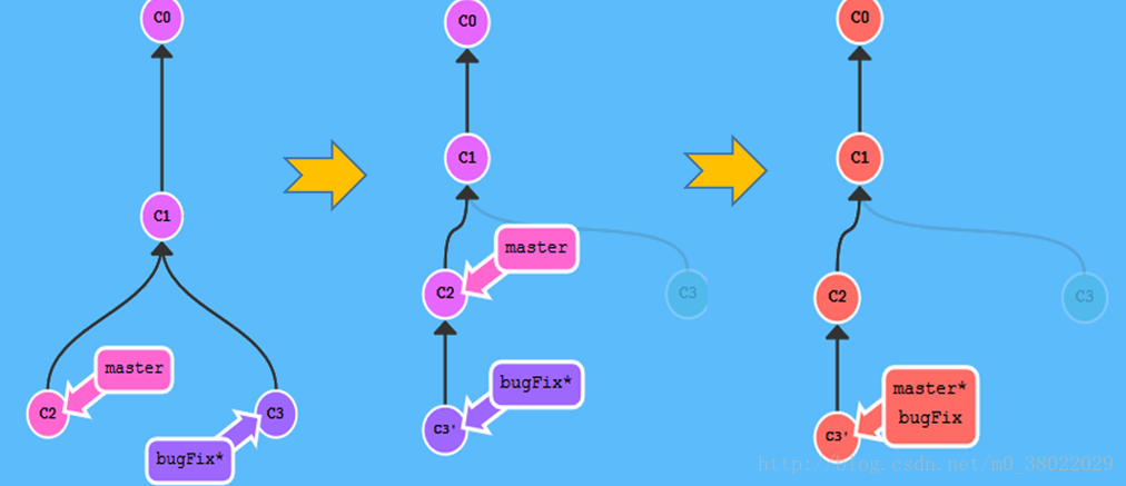 # 创建新分支 bugFix分支 git branch bugFix #提交一次(提交在master分支上) git commit # 切换到bugFix分支 git checkout bugFix # 提交一次(提交在bugFix分支上) git commit #使用git rebase把 bugFix 分支里的工作直接移到 master 分支上(移动以后会使得两个分支的功能看起来像是按顺序开发,但实际上它们是并行开发#的)。 git rebase master 注意:提交记录 C3 依然存在(树上那个半透明的节点),而 C3'是我们 Rebase 到 master 分支上的 C3 的副本。 #切换到master分支上(为了进行更新master的操作) git checkout master #把master的 rebase 到 bugFix 分支上(由于 bugFix 继承自 master,所以 git 只是简单的把 master 分支的引用向前移动了一下而已。) git rebase bugFix