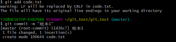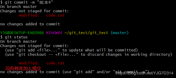 (3)git commit创建一个版本,并使用git status查看,发现第二次修改code.txt内容之后,并没有将其添加的工作区,所以创建版本的时候并没有被提交。