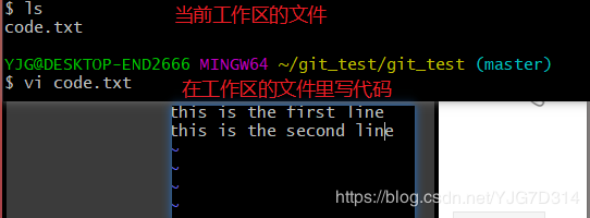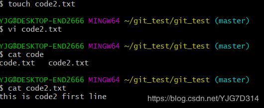 (1)下面在git test目录下再创建一个文件code2.txt,然后编辑内容如下: