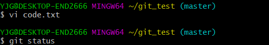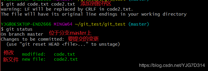 (4)我们使用如下命令把code.txt和code2.txt加入到暂存区,然后再执行git status命令,结果如下: