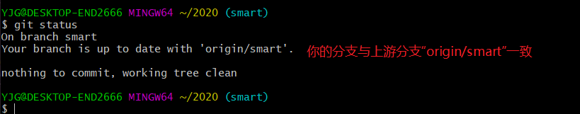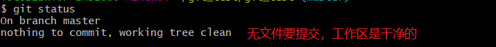 (6)一旦提交后,如果你又没有对工作区做任何修改,那么工作区就是“干净”的。执行如下命令可以发现: