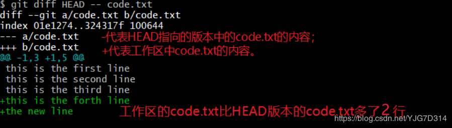 (2)现在要对比工作区中code.txt和HEAD版本中code.txt的不同。使用如下命令: