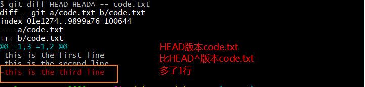 (1)现在要对比HEAD和HEAD ^版本中code.txt的不同,使用如下命令: