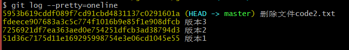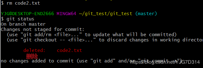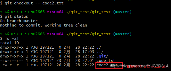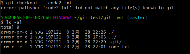 另一种情况是删错了,可以直接使用git checkout – code2.txt,这样文件code2.txt又回来了。