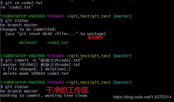 (2)现在你有两个选择,一种情况是确实要从版本库中删除该文件,那就用命令 gitrm删掉【永久删除,无法撤消】,并且 git