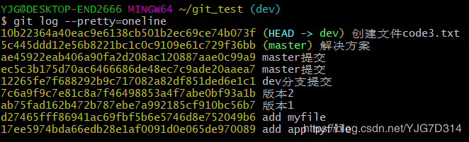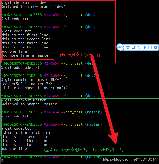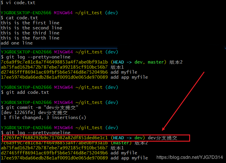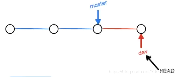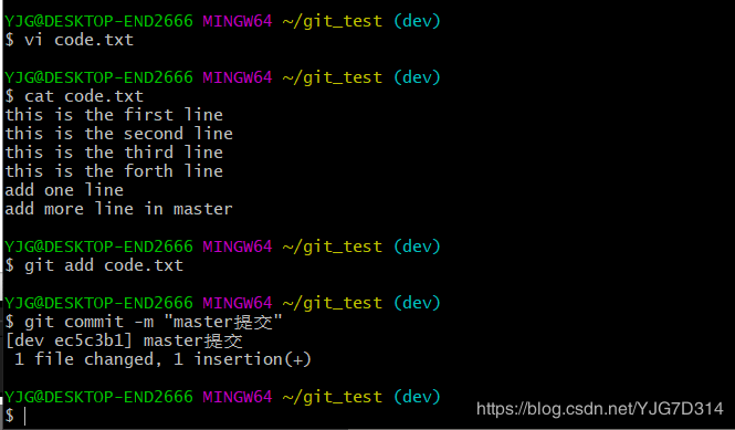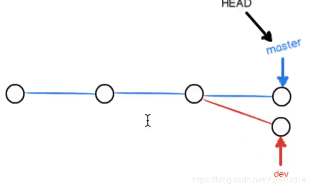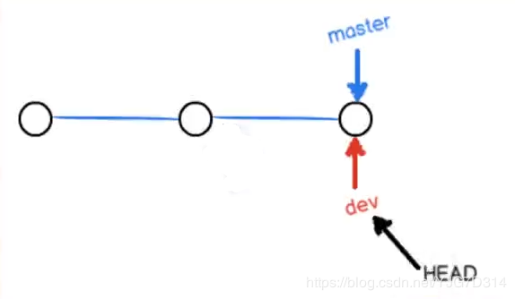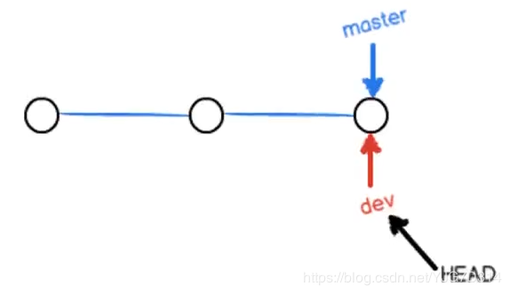查看code.txt,发现添加的内容没有了。因为那个提交是在dev分支上,而master分支此刻的提交点并没有变。【这里需要细细品味一下】