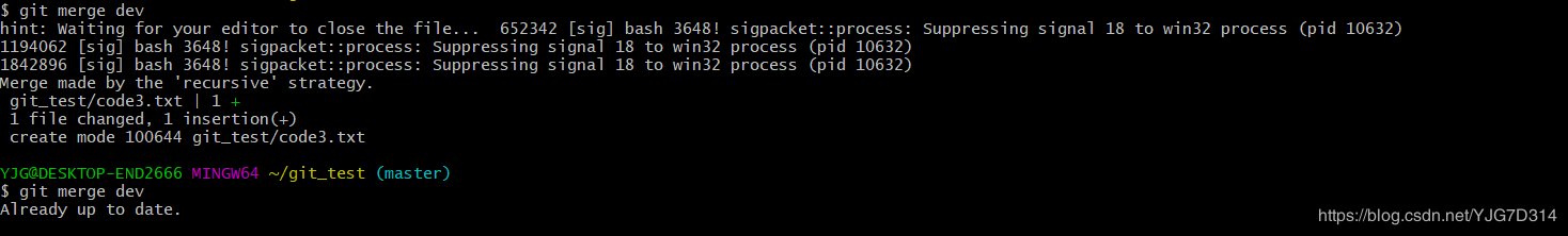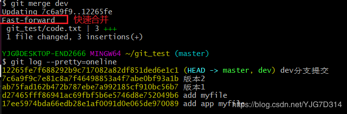 git merge命令用于合并指定分支到当前分支。合并后,再查看code.txt的内容,就可以看到,和dev分支的最新提交是完全一样的。