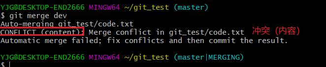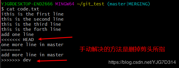 git告诉我们,code.txt文件存在冲突,必须手动解决冲突后再提交。