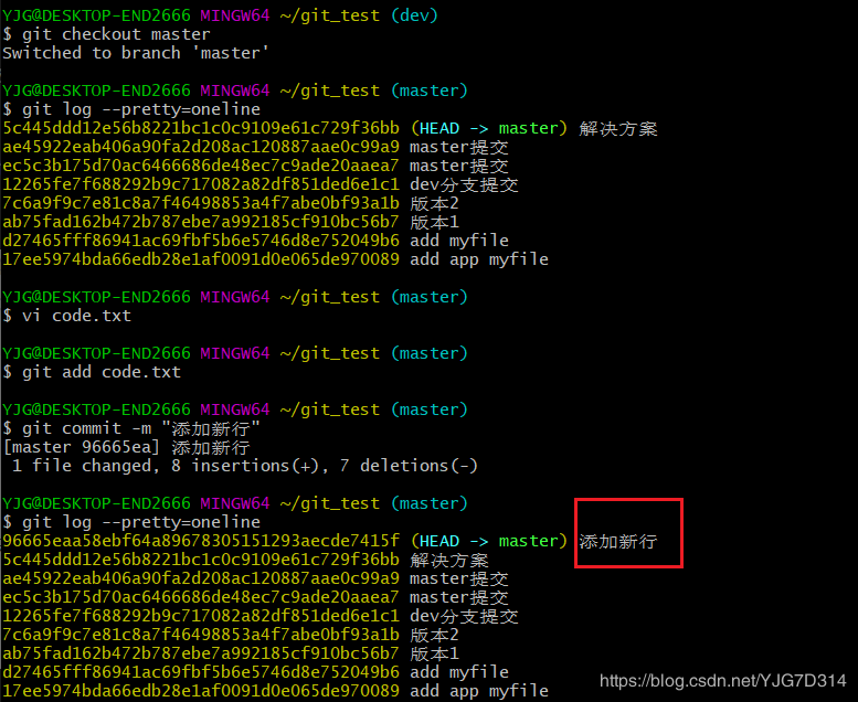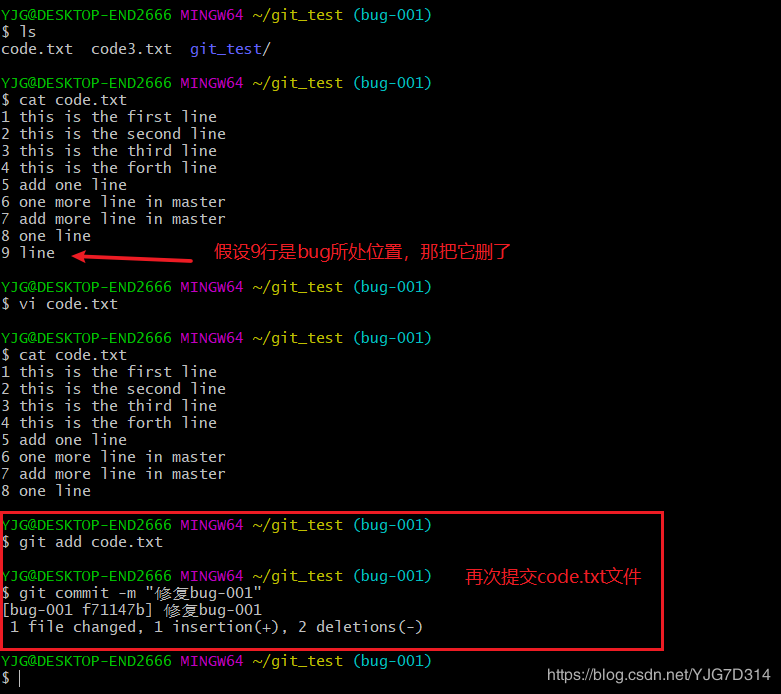 (4)现在修复bug,这里假设把code.txt里的第9行删掉,然后提交。