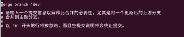 (5)出现如下提示时,这是因为这次不能进行快速合并,所以git提示输入合并说明信息,输入之后合并内容之后git会自动创建一次新的提交。