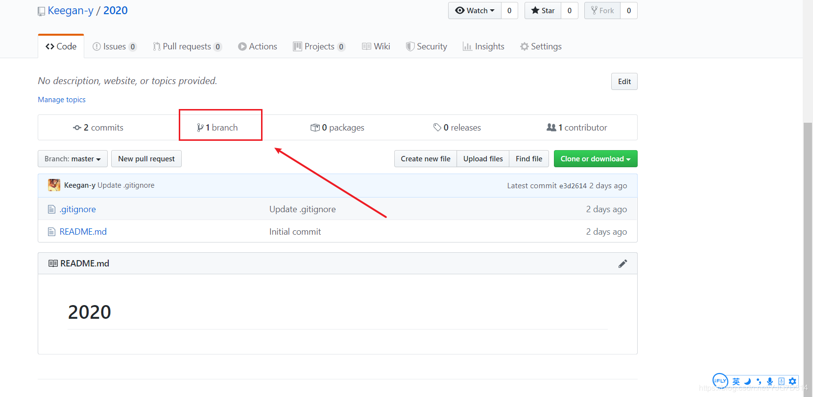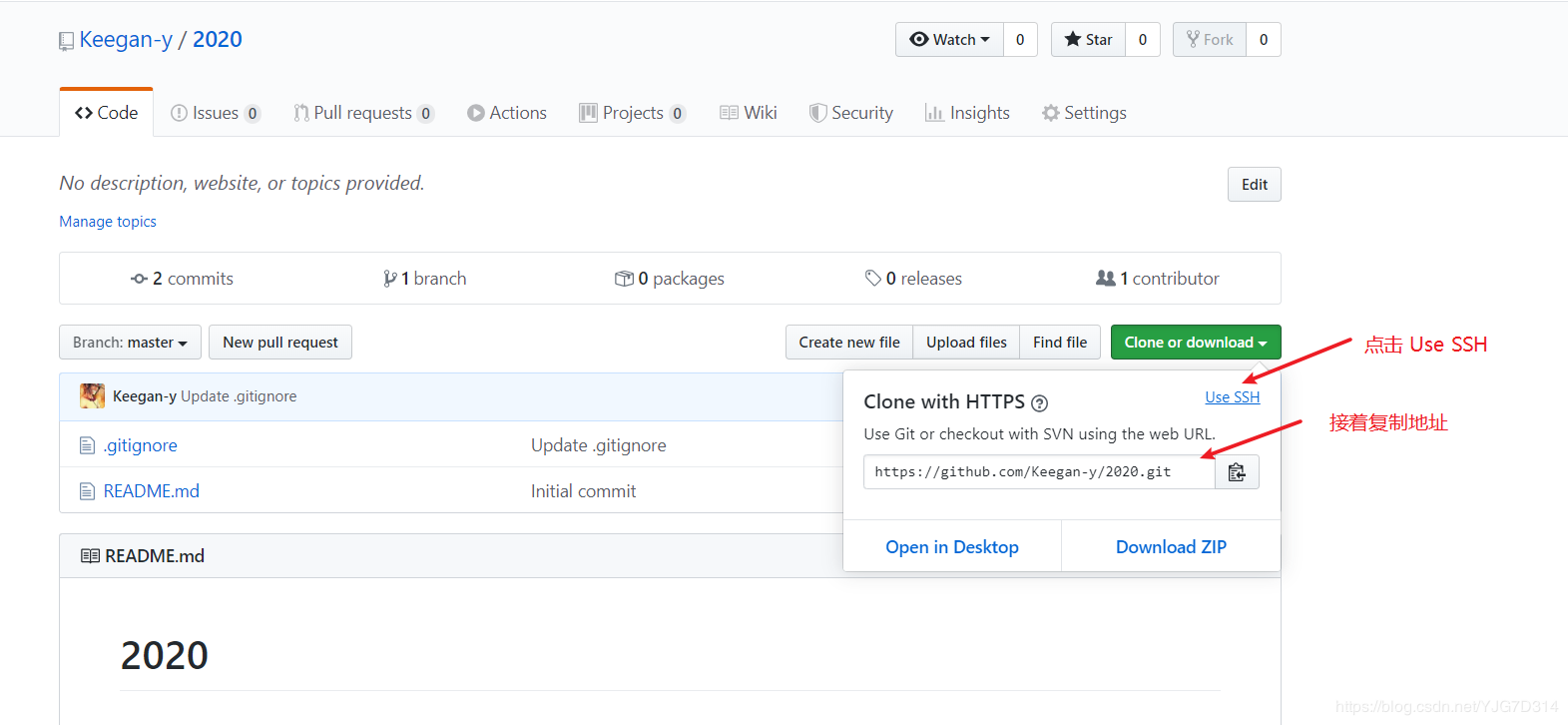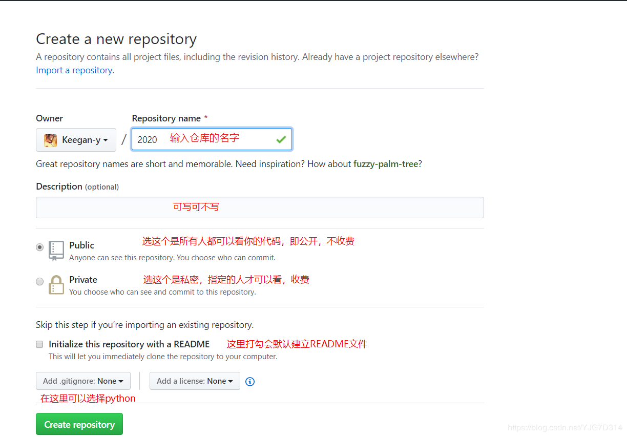 (2)在新页面中,输入项目的名称【如2020】,勾选'readme.md',点击'Create repository'