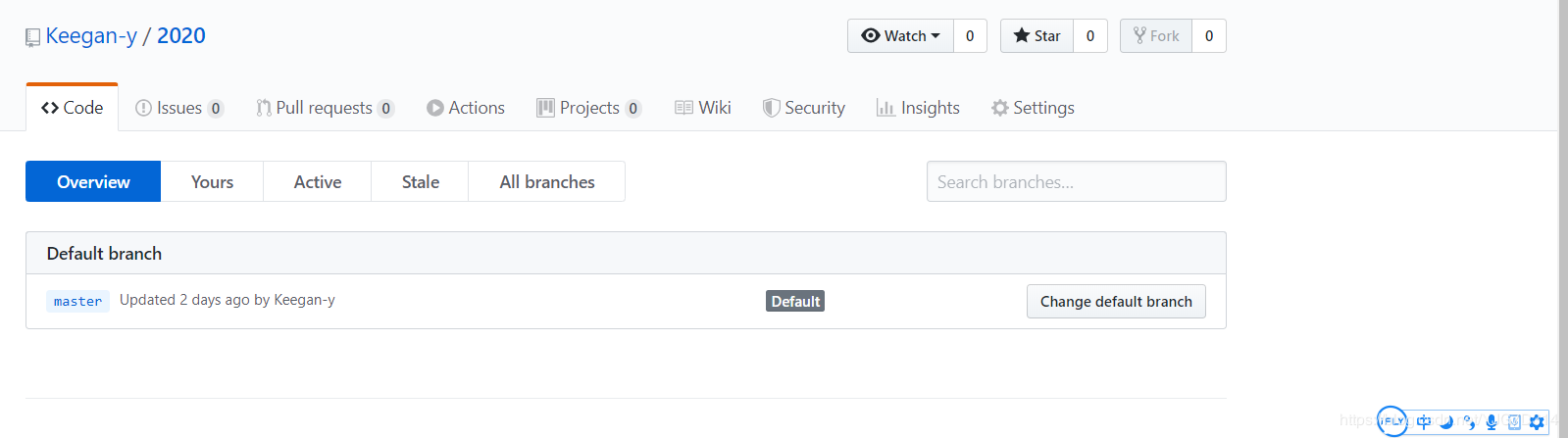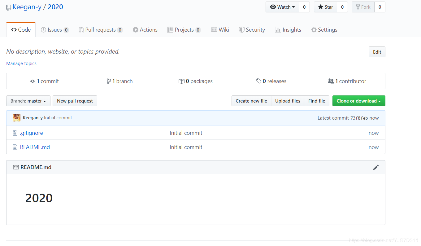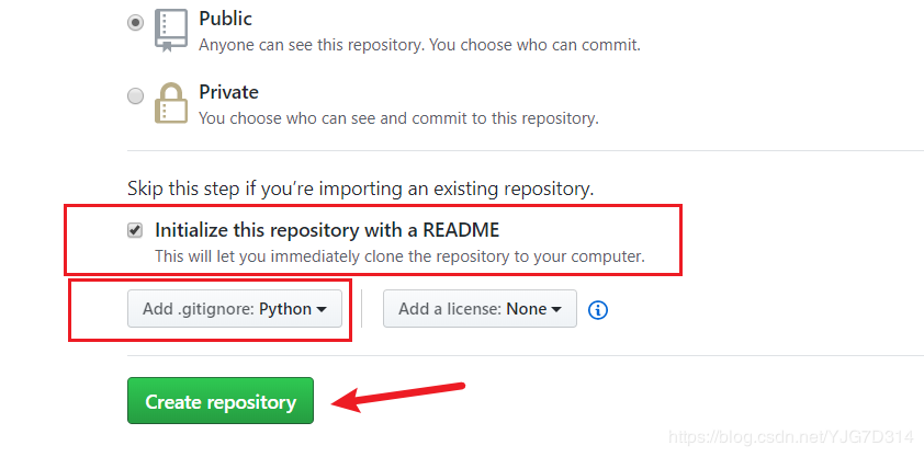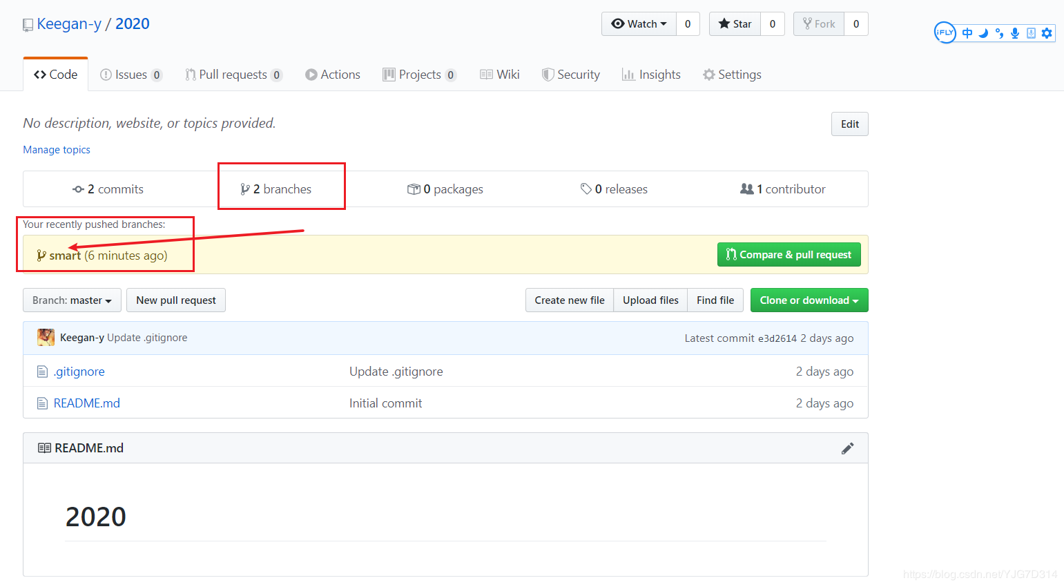 (2)在新页面中,输入项目的名称【如2020】,勾选'readme.md',点击'Create repository'