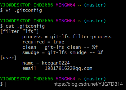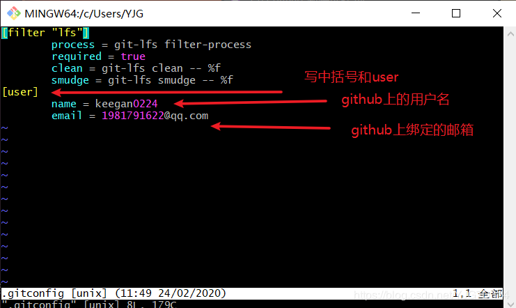 (2)在git的命令行中,回到用户的主目录下,编辑文件.gitconfig,修改某台机器的git配置。