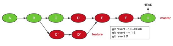 git revert G git revert F -m 1 git revert D..E git cherry-pick C`` git cherry-pick D`` git cherry-pick E``
