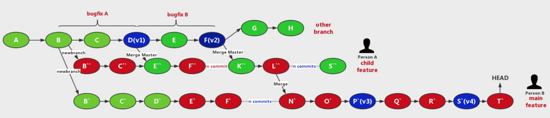 如以下场景中,我们期望回归的节点之间含有一次合并导致我们无法一次回滚到位。有两种方式: