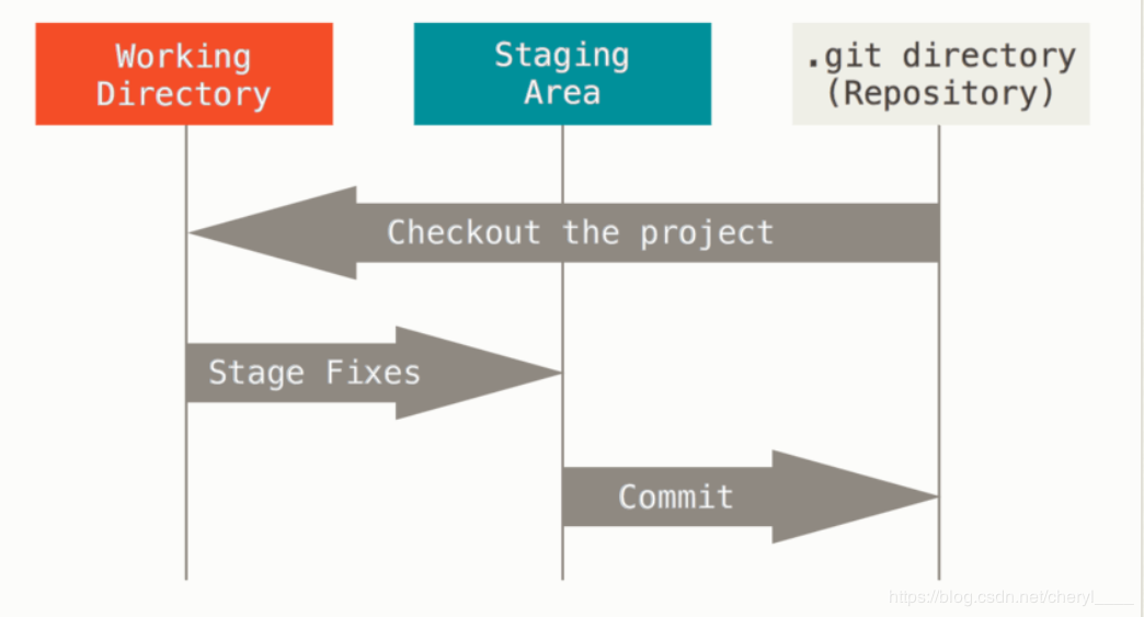 Git是一种分布式版本控制系统,通常这类系统都可以与若干远端代码进行交互。Git项目具有三个主要部分:工作区,暂存目录,暂存区,本地目录: