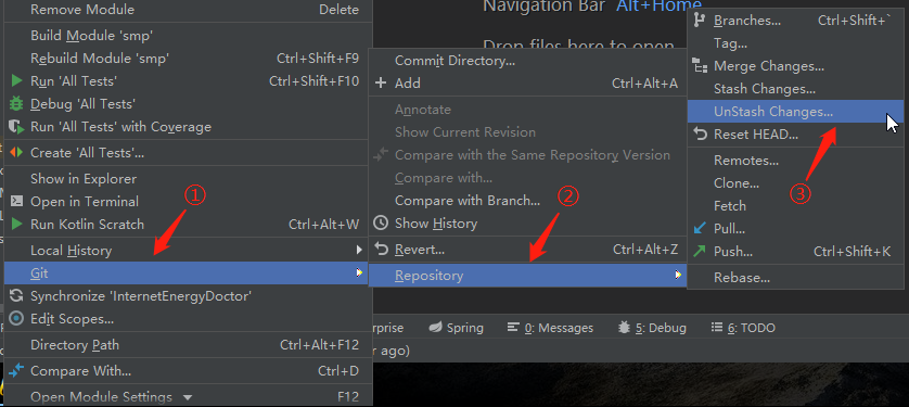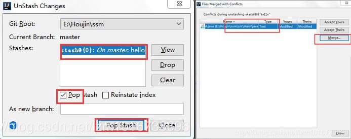 3. 最后再点击UnStash Changes--> PopStash ,这样就将之前的改动合并到本地;