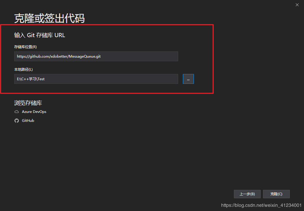 点击克隆,一段时间后项目被拷贝到本地, 之后本地地址与远程地址即建立关联,就可以使用VS进行代码提交、拉取、同步等。
