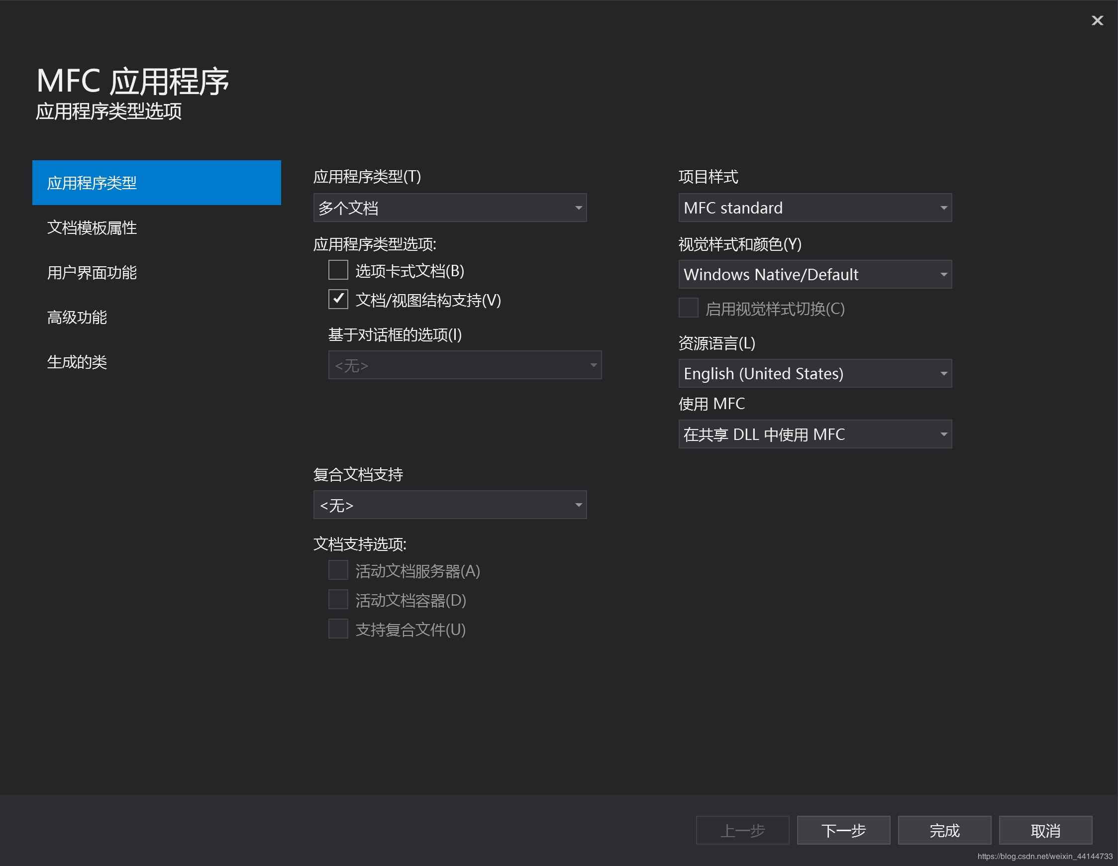 3、然后选择应用程序类型,项目样式也可以向老师看齐,改成MFC Standard应用程序类型