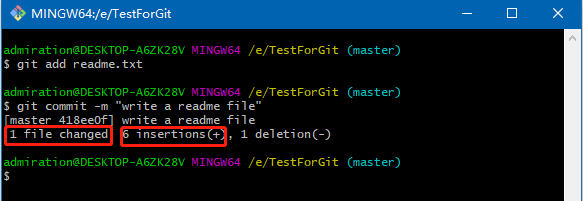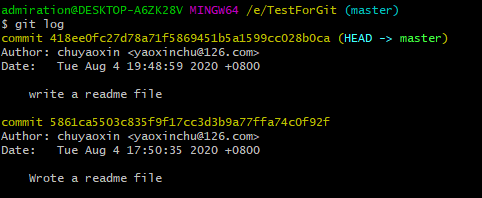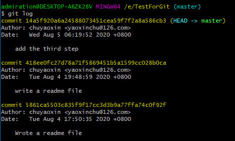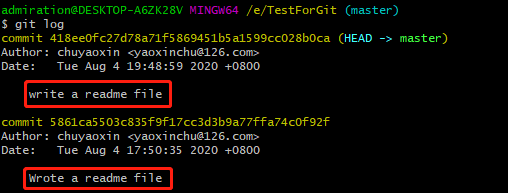 从这张图也可以看出之前git commit -m "write a readme file"中,-m部分的作用,这个和编程时写注释是一样的,可以不写,但是写的话方便以后的工作。