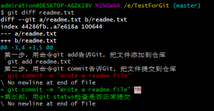 git status可以让我们知道有没有正常提交,比如上面那个例子,但如果要查看文件到底修改了什么内容,可以使用git diff 文件名命令