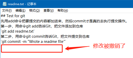 此时,再打开readme.txt,我对此文件的第二次修改被取消掉了