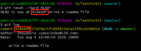 再输入git log查看,此时的版本号已经发生了变化,最新修改的那个版本号没有显示出来了