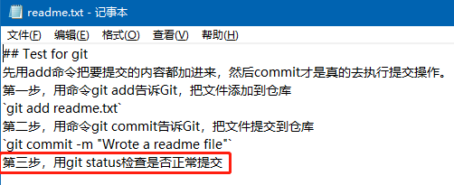 比如我先在readme.txt中添加了一行,然后git add readme.txt,git commit -m "add the third step",添加并提交到仓库