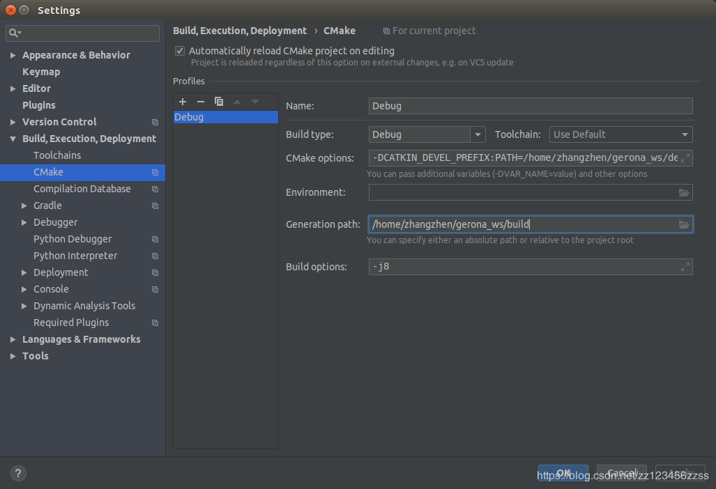 修改Settings->Build->CMake中的设置,将“CMake options”一栏修改为“-DCATKIN_DEVEL_PREFIX:PATH=/home/user_name/workspace_name/devel”;将"Generation path"一栏修改为“/homeuser_name/workspace_name/build”。如下: