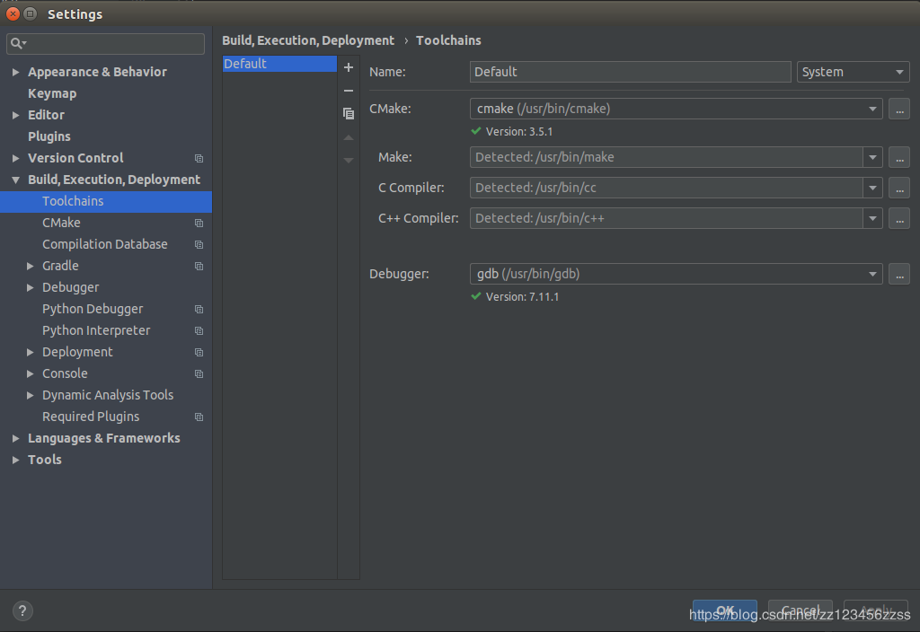 默认情况下,CLion编译使用的CMake是其内置的一个版本,而使用这个版本的CMake进行编译时会报出一些莫名其妙的错误,命令行中catkin_make明明可以正常编译,而这里就是会失败。解决这个问题的办法就是将CLion中的CMake更换为系统中的CMake,具体设置在Settings->Build->Toolchains,可以看到其中的CMake默认为Bundled,我们需要手动指定为系统中的CMake,具体看下图: