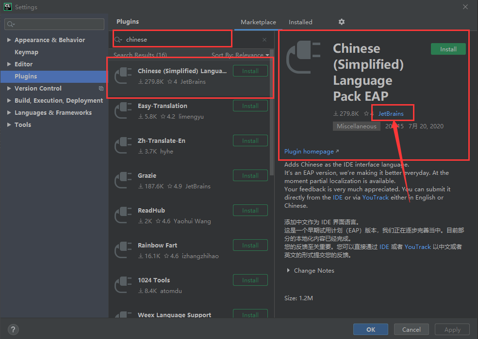 之后在搜索框中搜索Chinese,找到Chinese(Simplified) Language Pack EAP