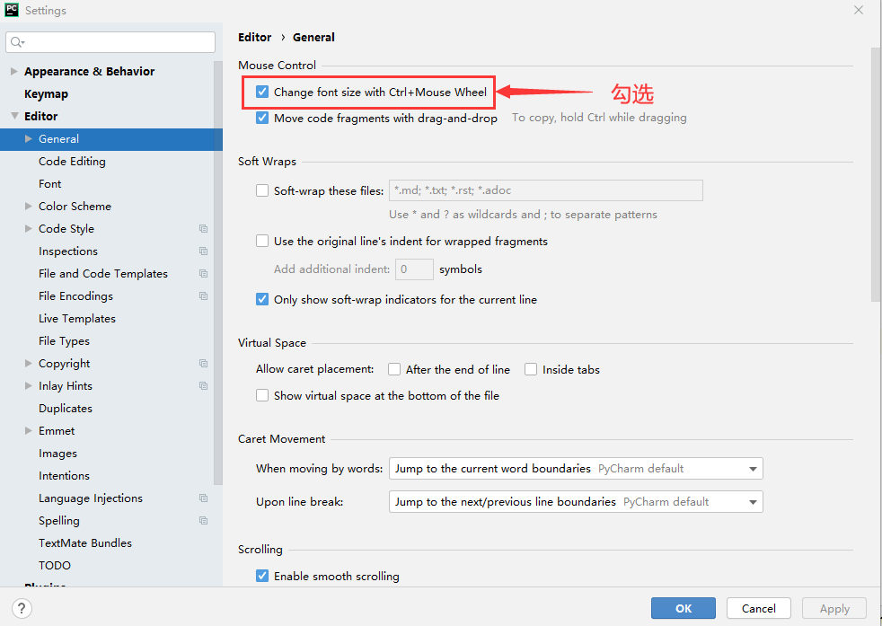 ② 设置使用CTRL + 鼠标滚轮调节代码字体大小