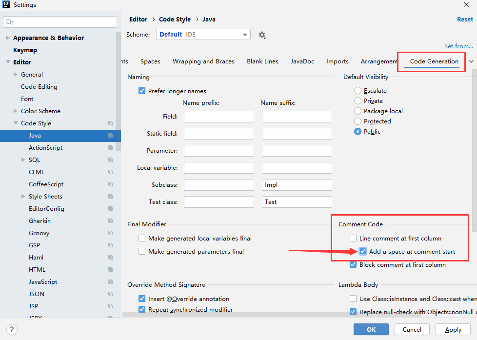 可以通过File -> Setting -> Editor -> Code Style -> Java -> Code Generation 下如图设置即可