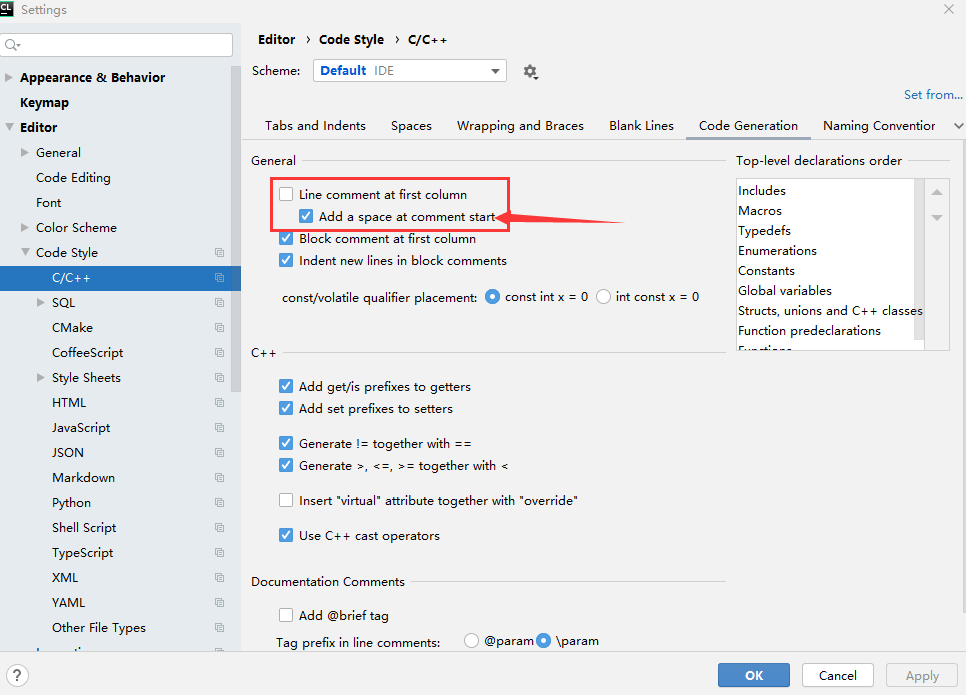 对于Clion,进入File -> Setting -> Editor -> Code Style -> C/C++ -> Code Generation