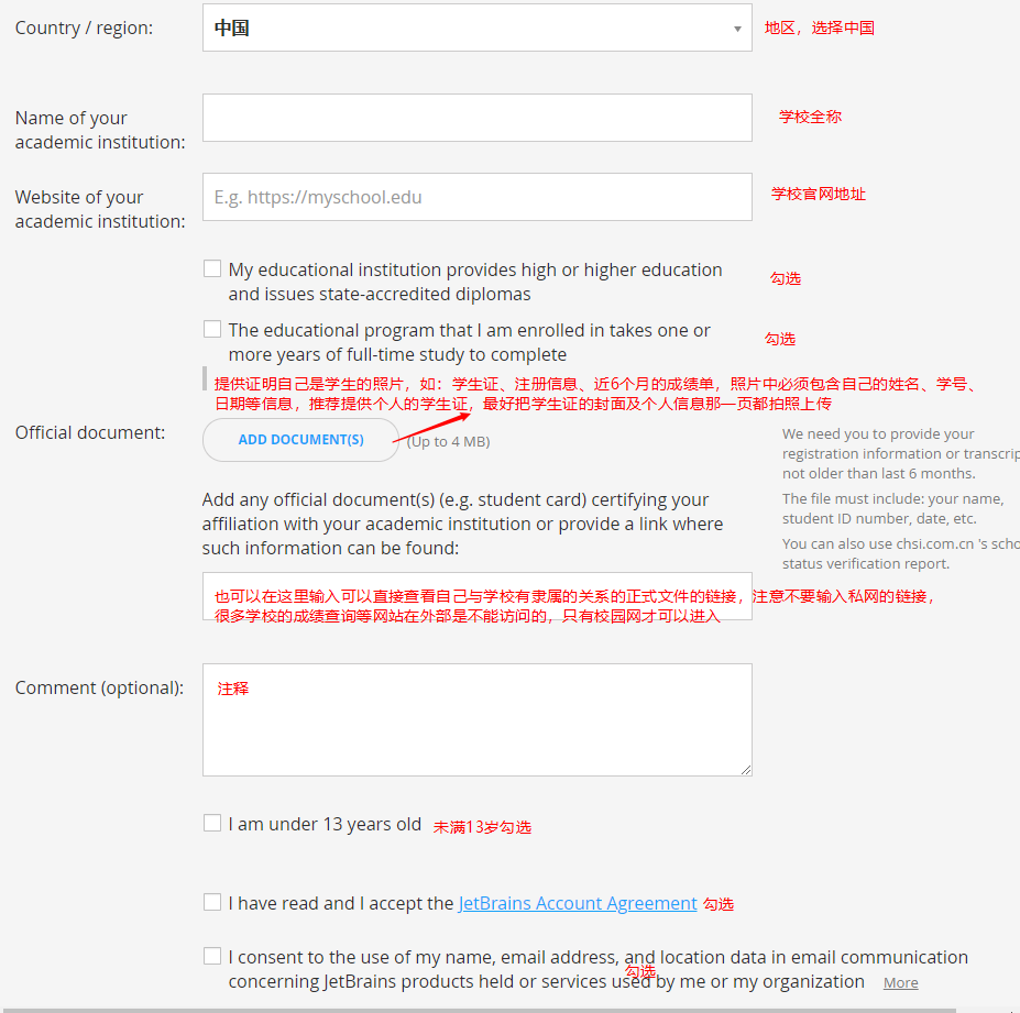 根据图片中的注释完成学生认证的申请既可以,注意学生证的照片要拍清晰,可以上传不止一张照片。填写的电子邮箱也将是以后JetBrains的账号。