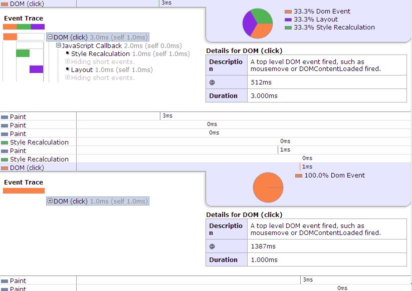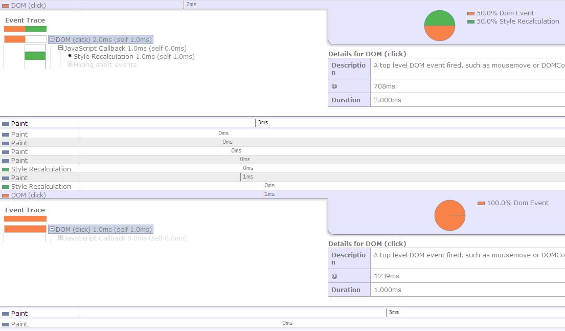 图上第一次点击执行2ms(其中有50% 用于style Recalculation), 第二次1ms,而且第一次click后面也跟了2次style Recalculation,而第二次点击却没有style Recalculation。