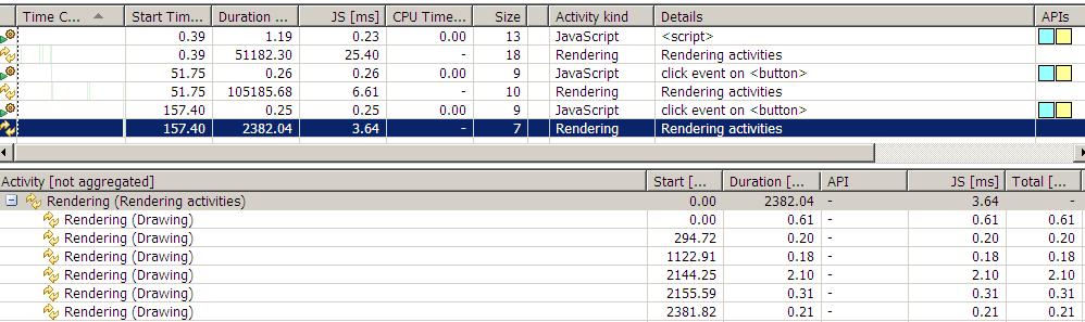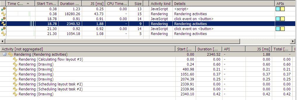 上图可以看到我们执行了2次button的click事件,每次click后都跟一次rendering(页面重绘),2次click函数执行的时间都差不多,0.25ms,0.26ms,但其后的rendering时间就相差一倍多。(这里也可以看出,其实很多时候前端的性能瓶颈并不在于JS的执行,而是在于页面的呈现,这种情况在用JS做到富客户端中更为突出)。我们再看图的下面部分,这是第一次rendering的详细信息,可以看到里面有2行是 Scheduleing layout task,这个就是我们前面讨论过的浏览器优化过的队列,可以看出我们引发2次的flush。